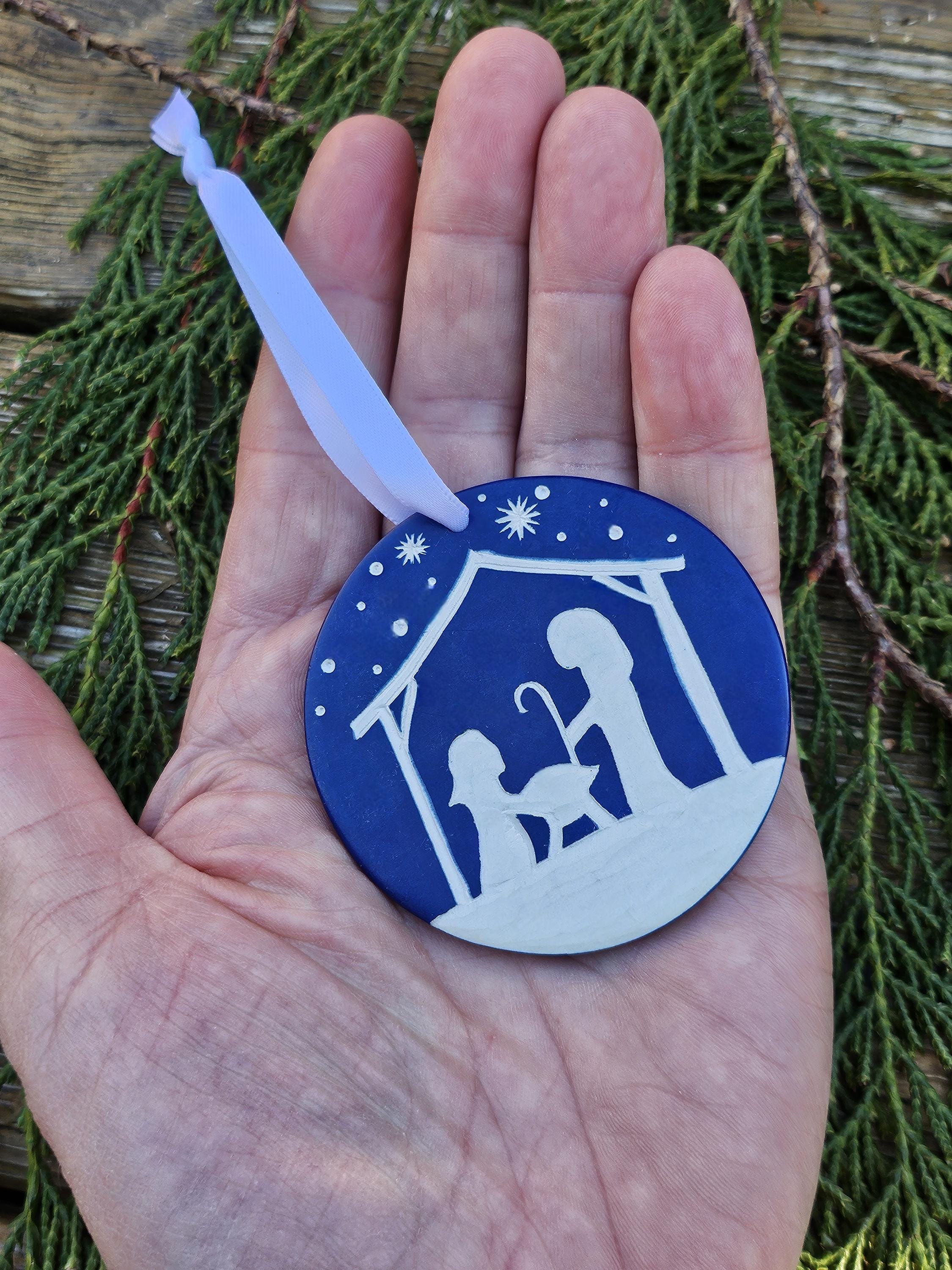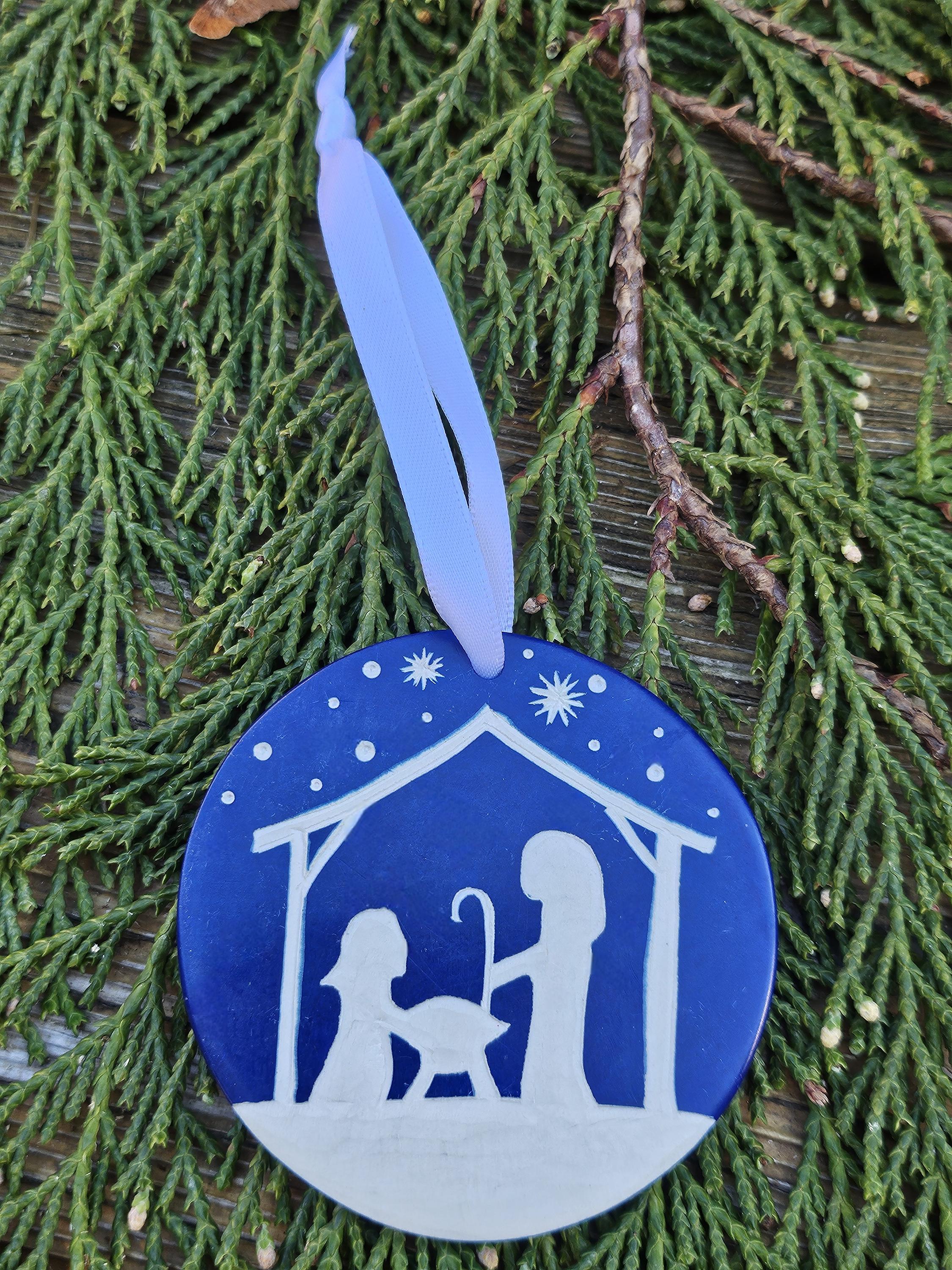 With a 2.5" diameter, these round ornaments make a stunning addition to your holiday decor. The natural white hue of the soapstone is exposed after the thin sliced stone is painted a deep blue, creating a nativity scene silhouette, which includes the iconic figures of Mary, Joseph, a stable, and a manger.
